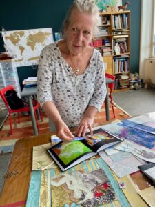 Carien werkt graag spontaan, kiest haar materialen intuïtief, moet ‘in flow’ zijn. Ze heeft er plezier in om met kleur te werken, vaak ook gekke kleurcombinaties. Als ze niet meer naar haar werk hoeft te kijken, is het klaar. Een enkele keer is het wachten op dat hele kleine snippertje papier, waar haar oog als bij toeval op valt en waarmee zij het beeld compleet maakt. Carien houdt zich ook bezig met ‘embroidered asemics’, oftewel gevoelsmatig getekende asemische teksten of tekens, geïllustreerd met borduursels. Het staat de ‘lezer’ vrij om deze te interpreteren. Asemic writing is een vorm van intuitief schrijven. Hebben woorden doorgaans betekenis, asemische woorden staan op zichzelf; tegelijkertijd is het heel goed mogelijk om hierin emoties kwijt te kunnen.