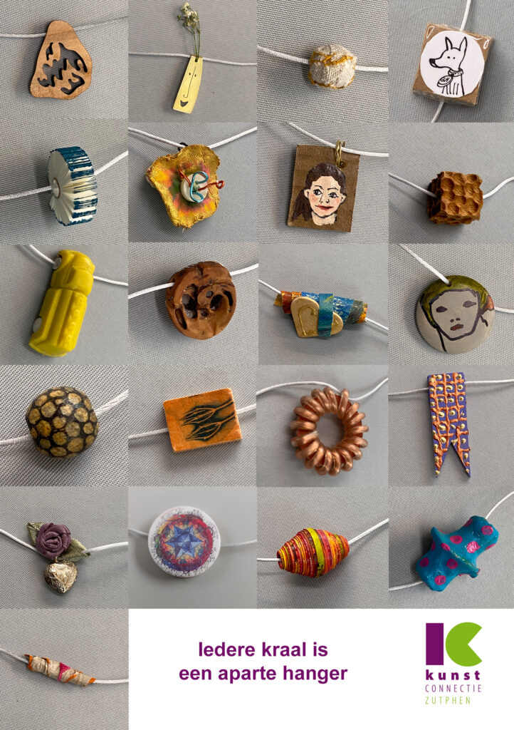 In 23 ateliers kunt u een ‘kunstzinnige ‘kraal’ verkrijgen. (te herkennen aan de oranje stippen bij de namen) In de Centrale expositie is er tegen een kleine vergoeding een snoer te koop. Het bijzondere kralensnoer maakt u compleet door de ‘kralen’ aan te schaffen bij de ateliers. Van €0,50 tot maximaal €10 ; de prijs van de kralen wordt bepaald door de kunstenaar.